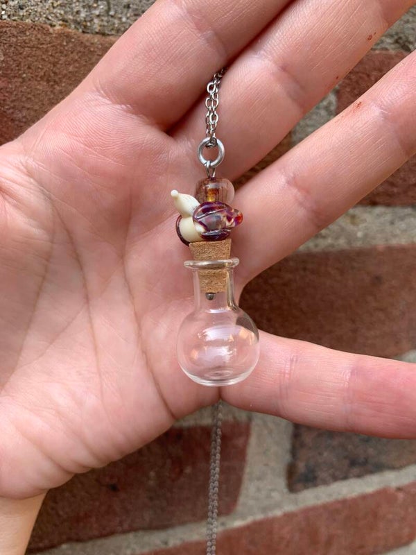 Klein lief flesjes met handgemaakte kralen aan een rvs ketting. Voor het bewaren van je magische vondsten of voor je mooiste potion bottles.